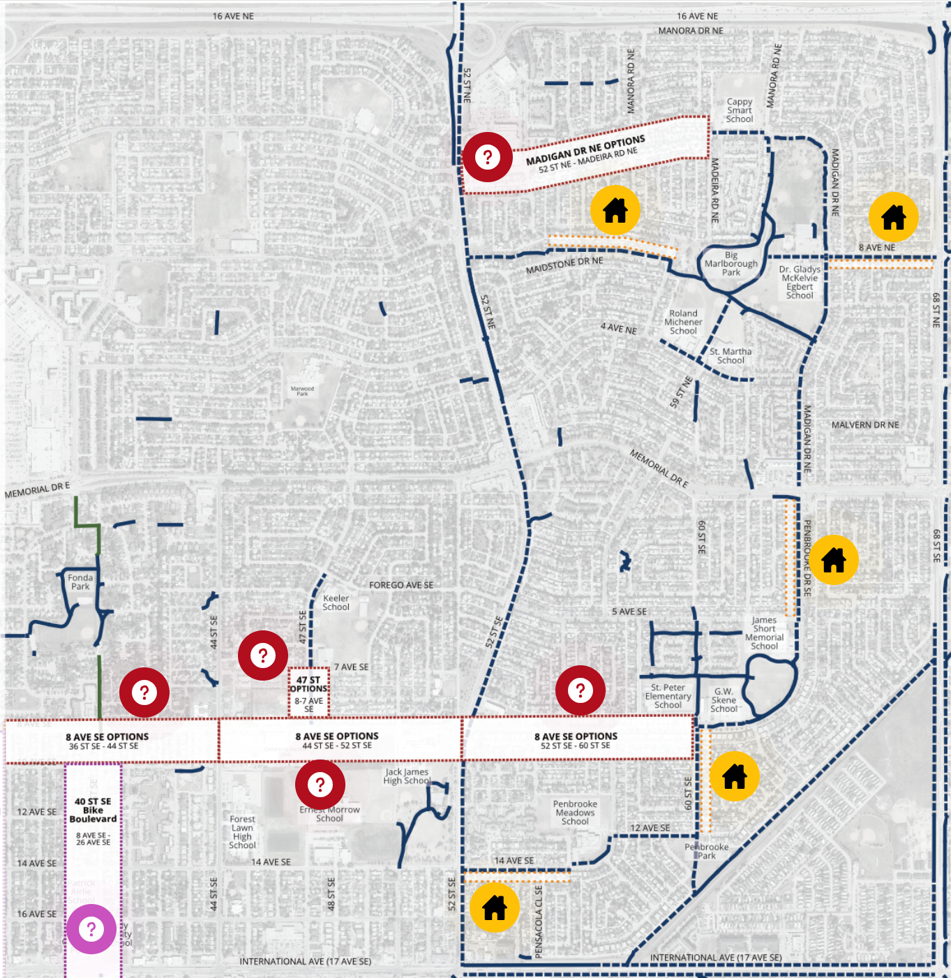 The City is designing improvements to pathways and bikeways for communities in Marlborough Park, Albert Park Radisson Heights, Penbrooke Meadows, Forest Heights, Forest Lawn, Dover, Southview and Erin Woods. These communities were selected because they align with Calgary's established Pathway and Bikeway Network. The proposed route designs aim to better connect Calgarians to their homes, work, school, parks and services. When routes are improved, they provide safe, healthy, and affordable travel choices for people of all ages and all abilities, year-round.